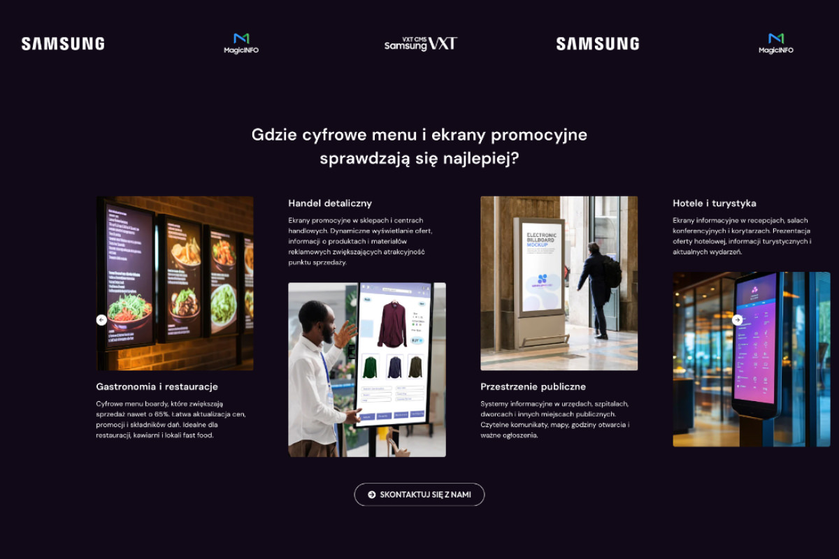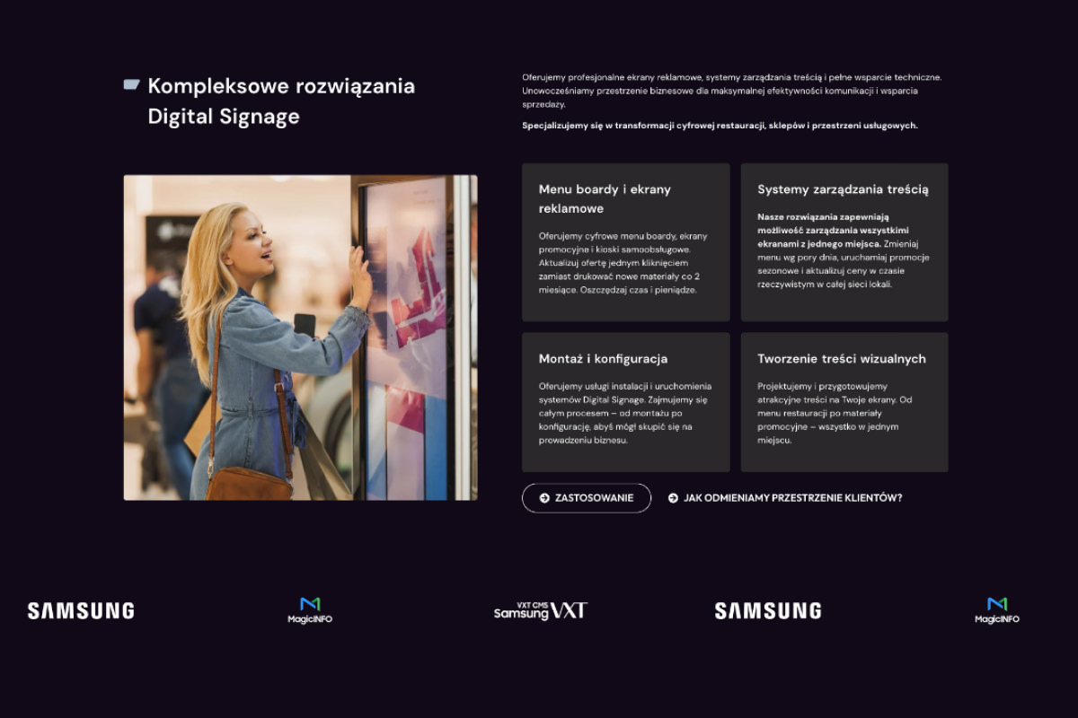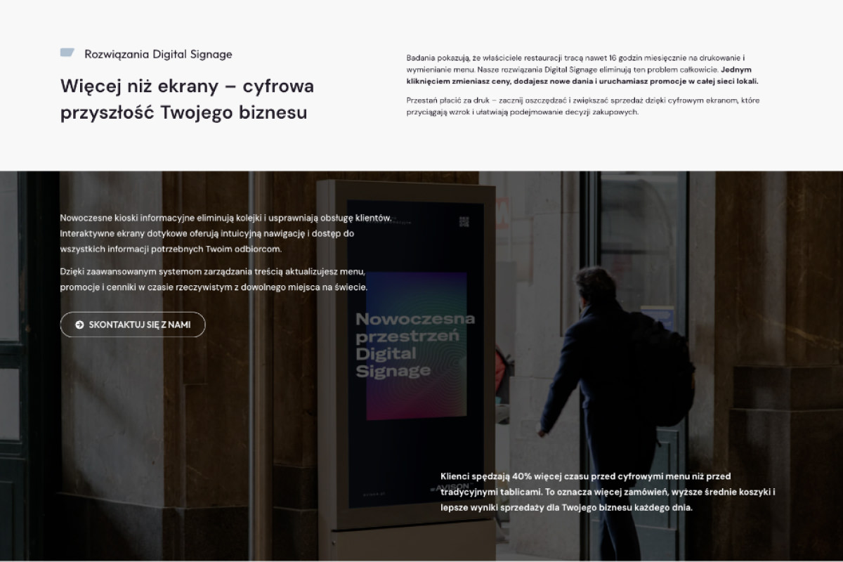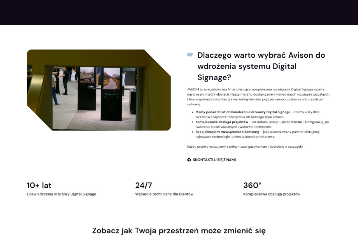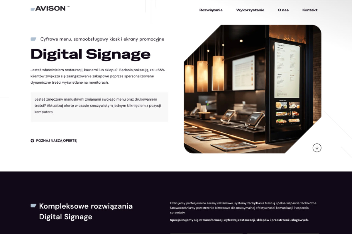 Centralnym elementem realizacji było wdrożenie landing page, który w przejrzysty sposób prezentuje ofertę AVISON oraz korzyści płynące z rozwiązań Digital Signage. Strona została zaprojektowana z myślą o efektywnej konwersji, prezentując konkretne dane i statystyki dotyczące wpływu cyfrowych rozwiązań na wyniki sprzedaży. Dodatkowo wdrożyliśmy podstawowe narzędzia analityczne umożliwiające monitorowanie ruchu i optymalizację działań marketingowych.