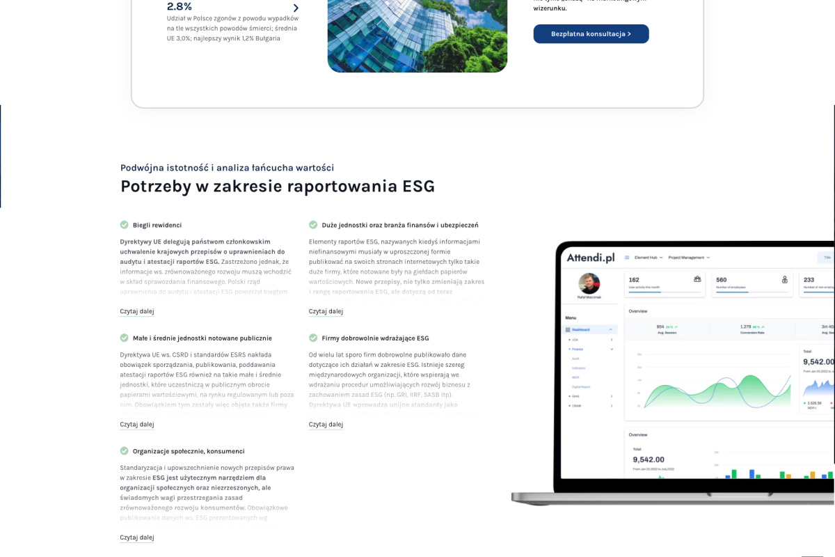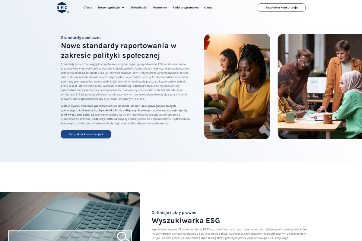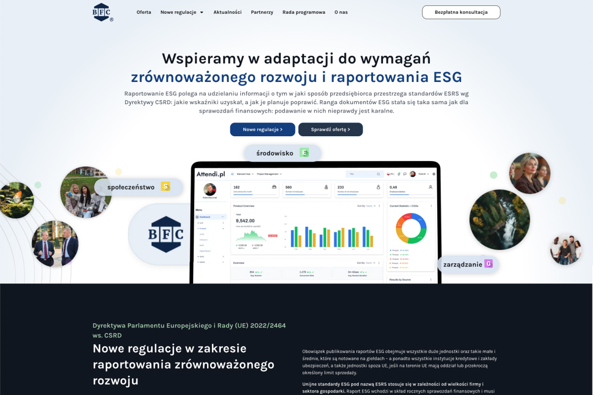 Dla ESGBFC stworzyliśmy nowoczesną stronę internetową, która stanowi kluczowe narzędzie w komunikacji z klientami i partnerami biznesowymi. Projekt został zrealizowany z uwzględnieniem specyfiki branży ESG i potrzeb różnych grup odbiorców – od firm zobowiązanych do raportowania ESG, przez organizacje wdrażające standardy dobrowolnie, aż po biegłych rewidentów potrzebujących eksperckiego wsparcia.