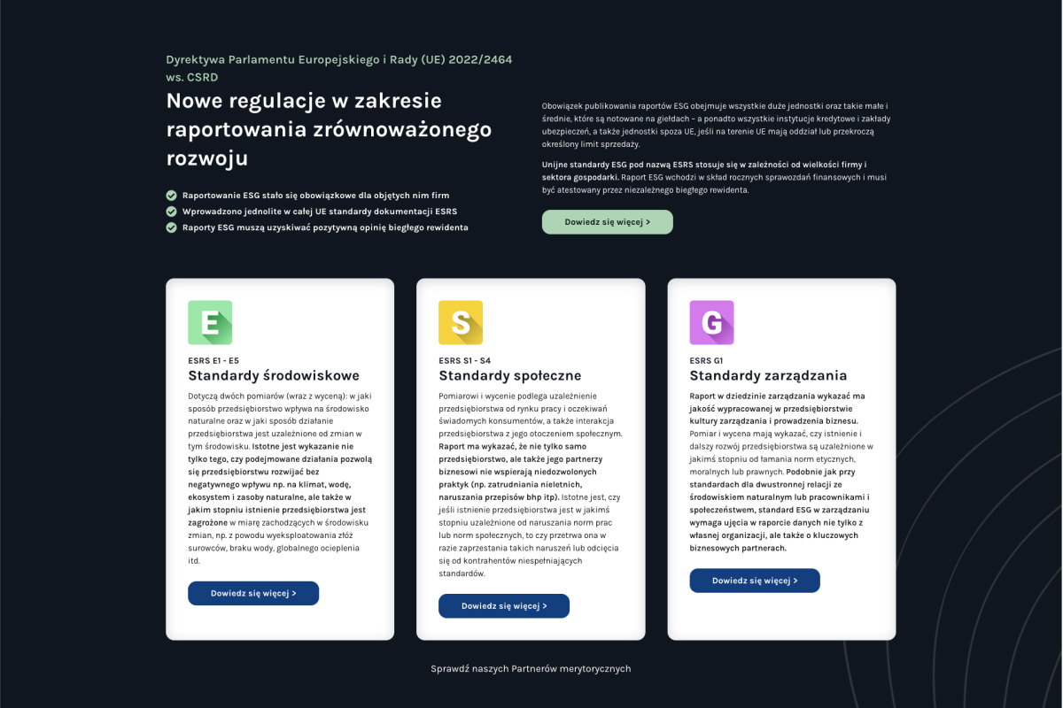 Szczególną uwagę poświęciliśmy architekturze informacji, tworząc przejrzystą strukturę, która ułatwia dostęp do specjalistycznej wiedzy z zakresu ESG. Wdrożyliśmy wyszukiwarkę fraz wraz z definicjami, który odpowiada na zapytania dotyczące standardów ESRS i wymogów raportowania.