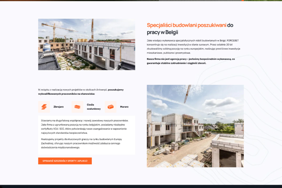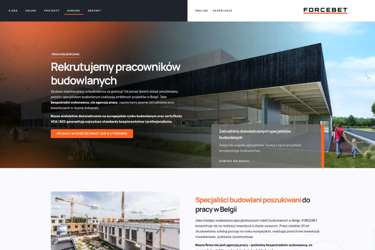 Dzięki naszej współpracy Forcebet Sp. z o.o. zyskał nowoczesne narzędzie komunikacji z potencjalnymi pracownikami, które w pełni oddaje wartości firmy i jej pozycję na rynku budowlanym.